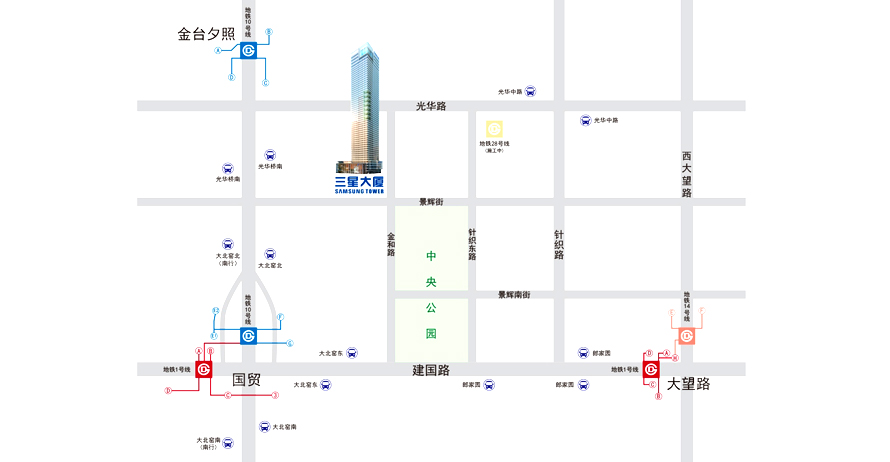 三星大厦坐落于CBD核心区,紧邻7万平米中央公园,建筑高度260米,地上57层,地下6层,是三星中国总部所在,旨在为世界500强和未来的世界500强企业打造国际化总部写字楼。CBD中央公园为CBD区域罕有的城市中央公园,位于三星大厦东南侧。进驻于此,纵览中央公园美景,尽揽都市繁华景色,张扬一览众山小的豪迈。三星大厦楼层中部,每两层设置一个双层挑高空中室内花园。不仅打造私属空中花园绿岛,更与CBD中央公园形成内外呼应的生态办公环境。项目位于长安街与东三环交汇处,地铁1号线、6号线、10号线、14号线、28号线(建设中)贯穿其间,便捷换乘全北京17条地铁线路,便捷连通北京各核心商务、商业区。距北京站仅3公里,至首都国际机场驱车仅需30分钟即可到达,便捷接驳世界。28号线(CBD线)2017始建,规划全长约6.5公里,初步规划设车站8座,主要服务于中央商务区,预计2020年实现通车。